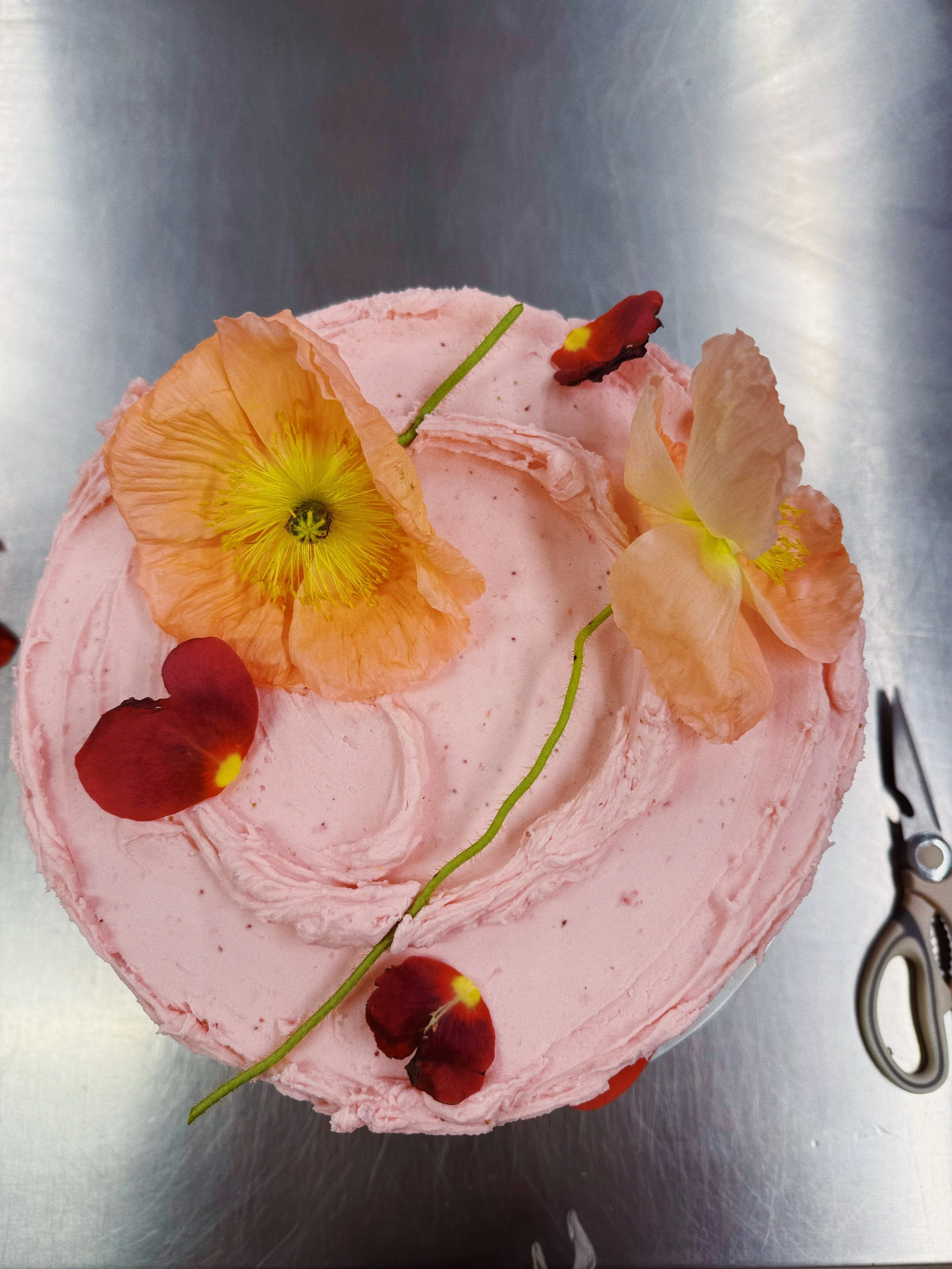 We bake using only what’s in season with fruit from Natoora and Shrub, and Wildfarmed flour. All cakes come decorated with seasonal, non-toxic flowers and/or fruit.